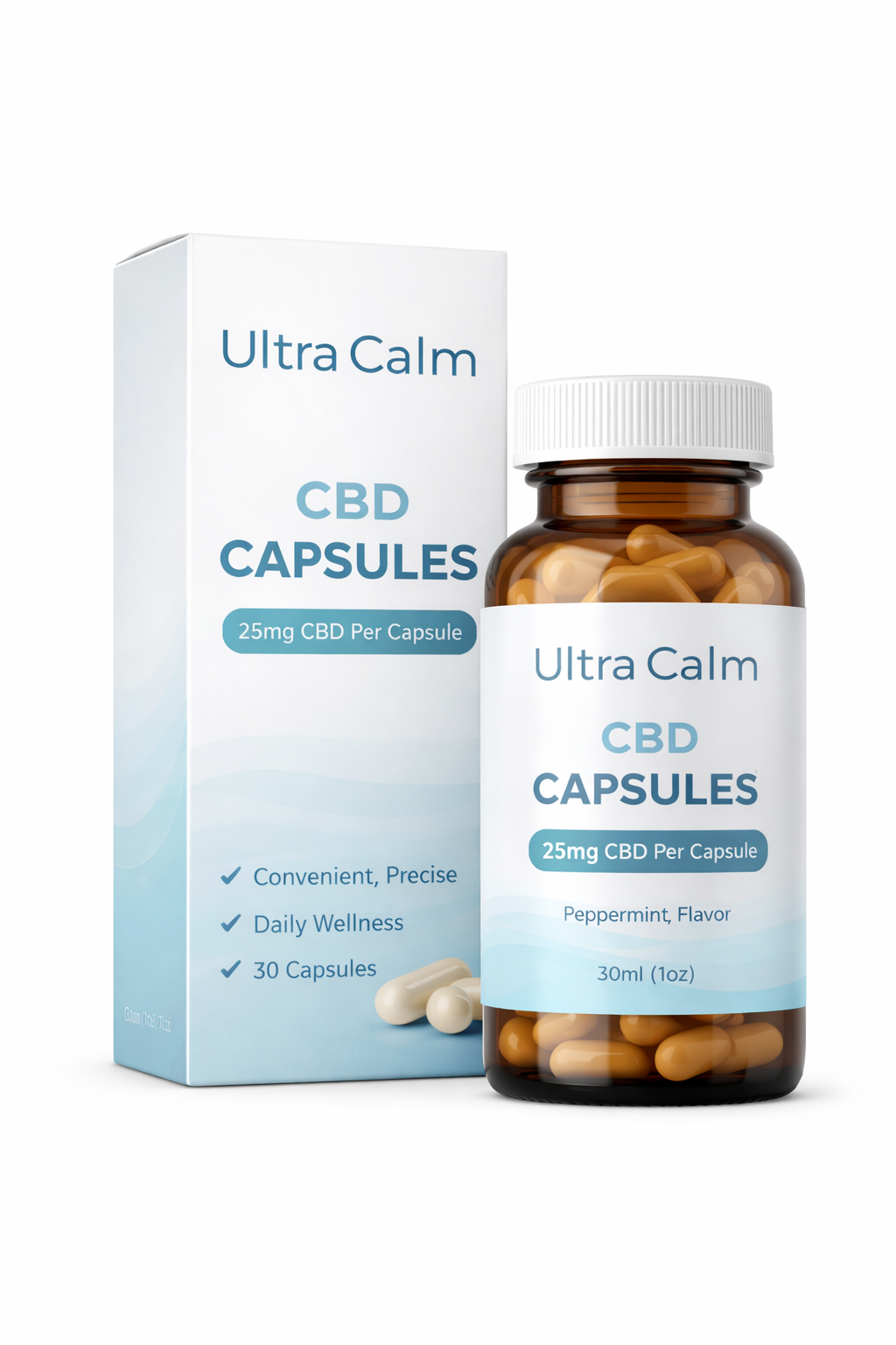 Ultra Calm CBD Capsules provide 25mg of CBD per capsule in a 30-count bottle for simple, consistent supplementation. Designed for users who prefer a tasteless, mess-free format with predictable daily dosing.